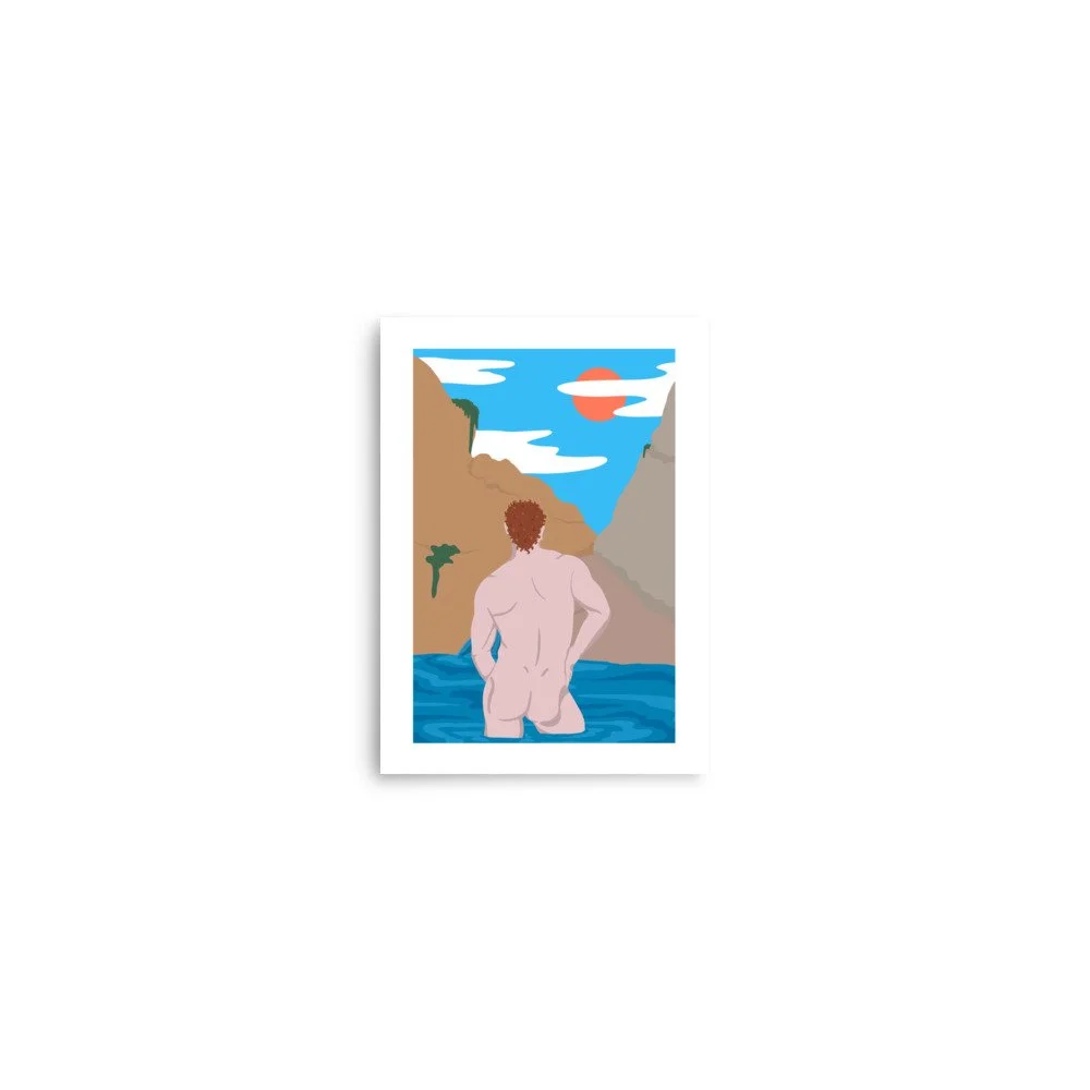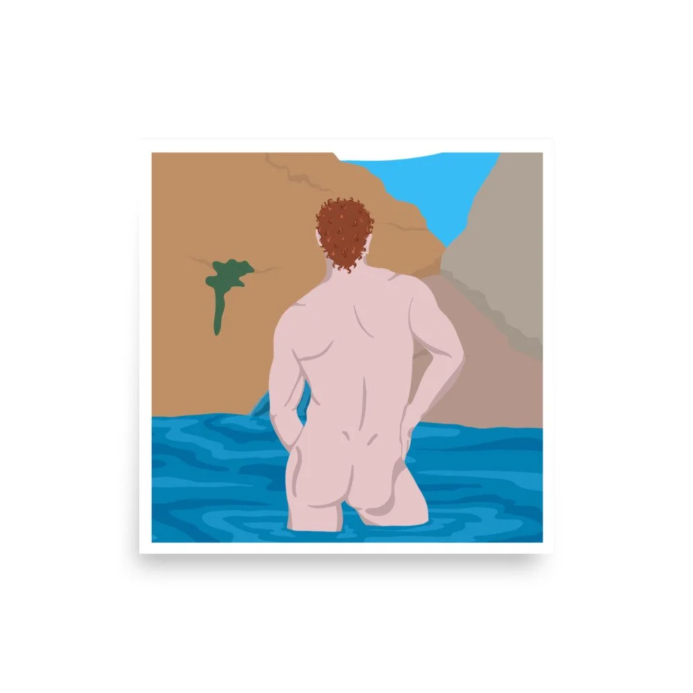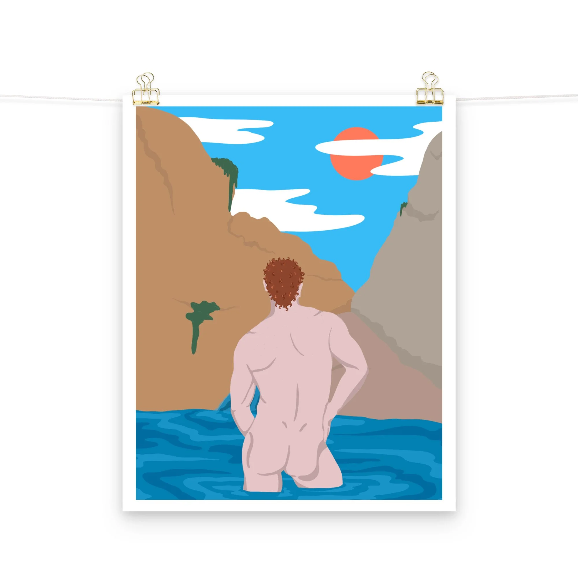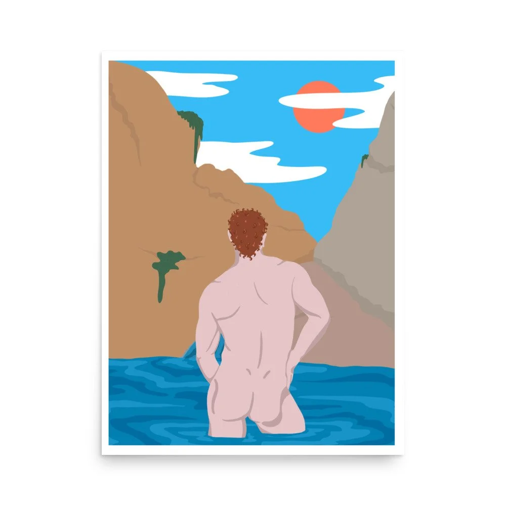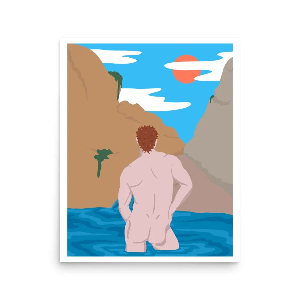 Immersed in nature and unapologetically bare, this artwork captures a quiet yet powerful moment of queer intimacy with the land. A nude figure stands waist-deep in cool blue water, gazing toward sunlit cliffs and a warm, glowing sky. The scene feels both serene and daring—blending raw masculinity with the stillness of natural beauty.