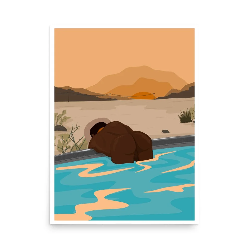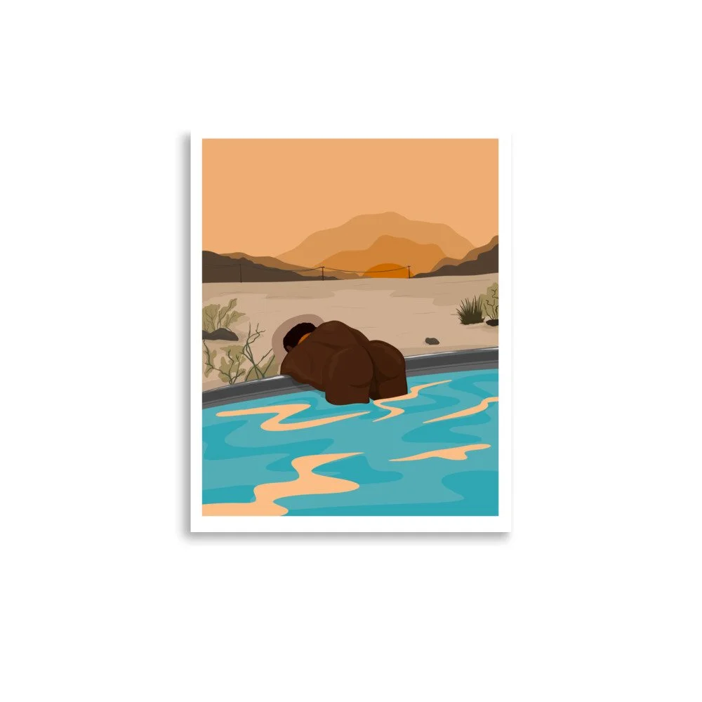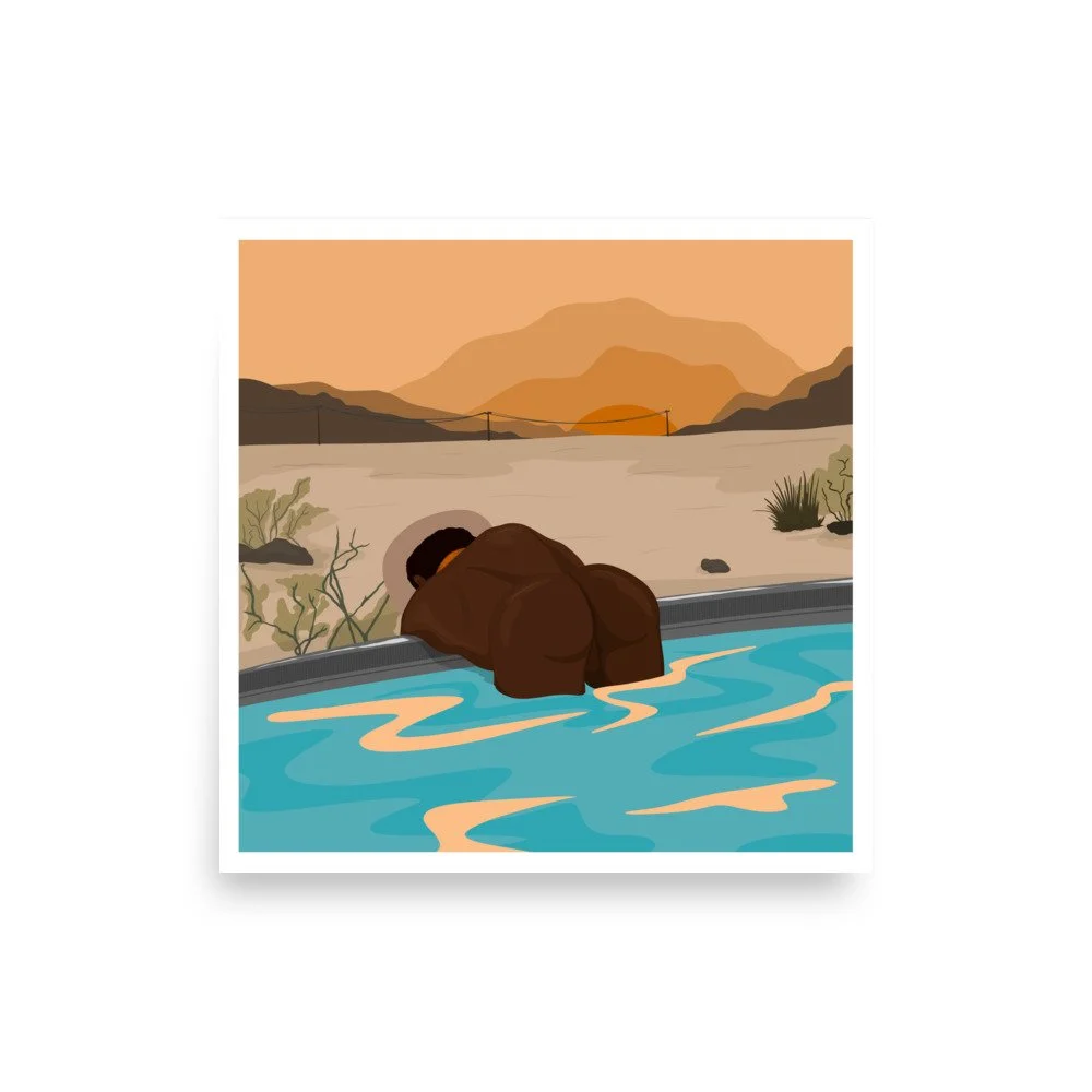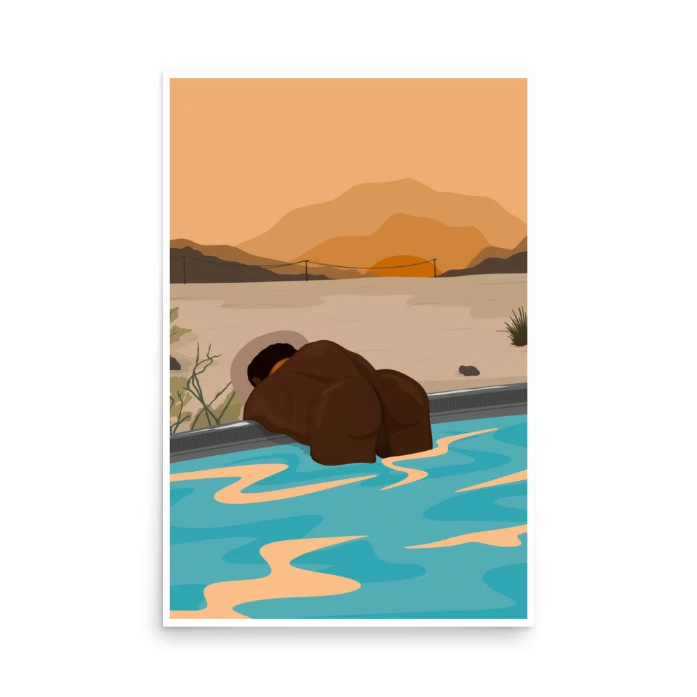 Sunset meets sensuality in this playful desert scene. A nude figure leans over the edge of a glowing turquoise pool, their body catching the warm light as mountains fade into a soft orange horizon. Surrounded by desert plants and power lines stretching into the distance, the artwork captures the unique mix of heat, solitude, and freedom found in the desert.