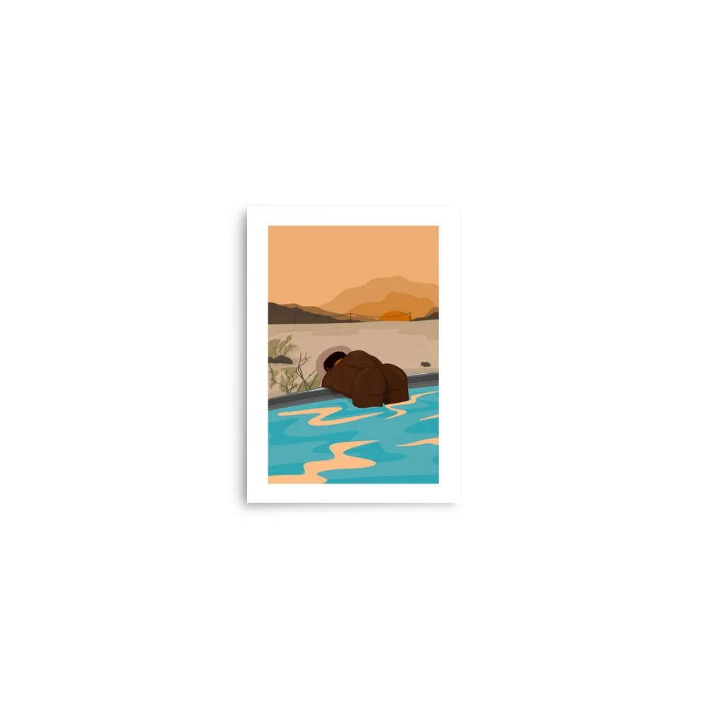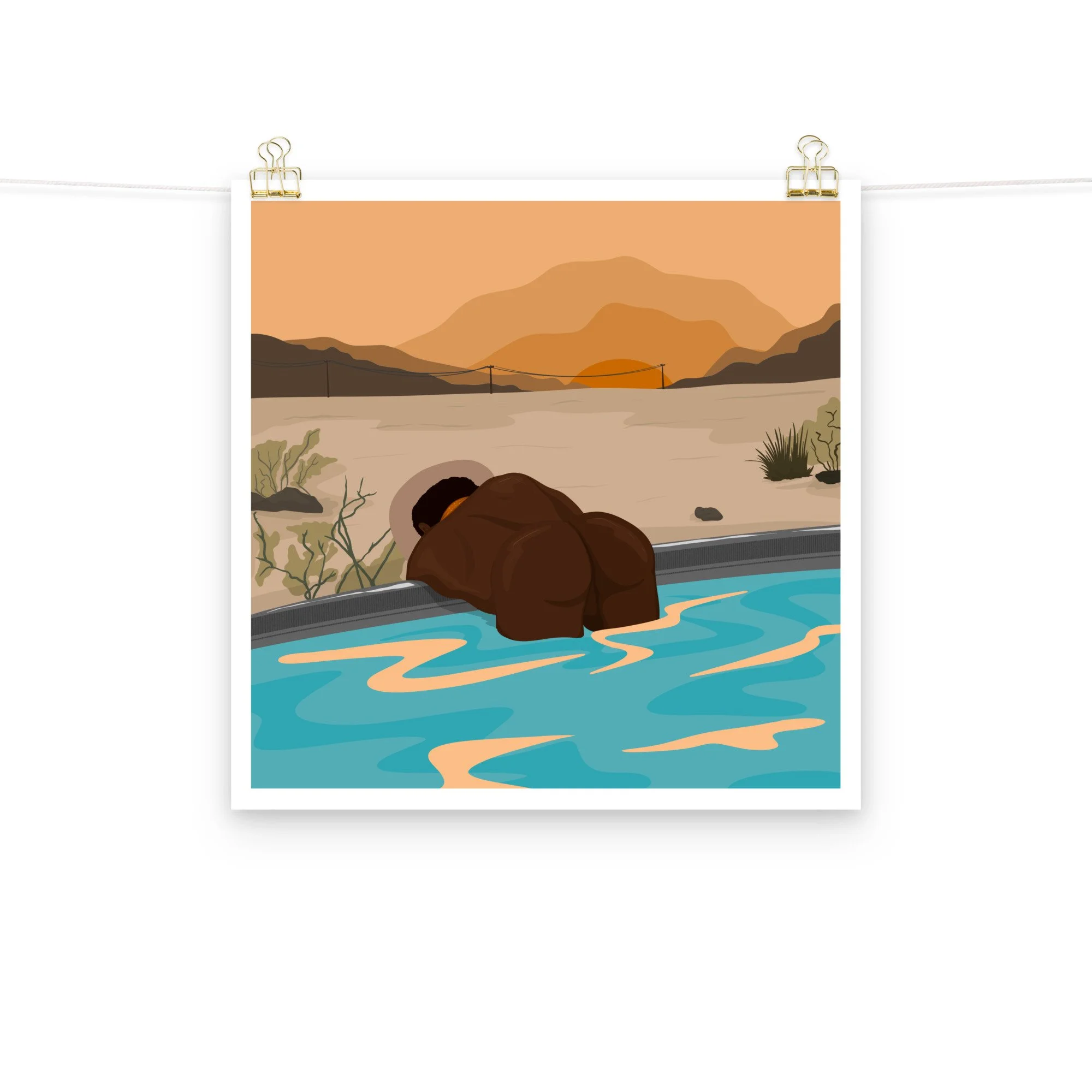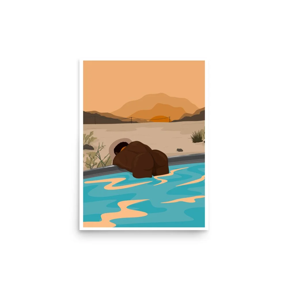 Sunset meets sensuality in this playful desert scene. A nude figure leans over the edge of a glowing turquoise pool, their body catching the warm light as mountains fade into a soft orange horizon. Surrounded by desert plants and power lines stretching into the distance, the artwork captures the unique mix of heat, solitude, and freedom found in the desert.